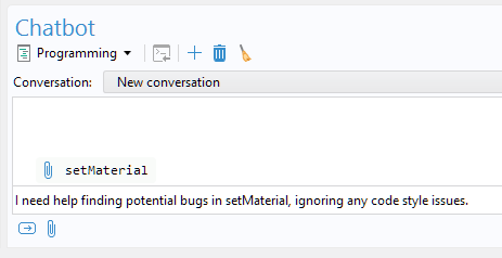 The Chatbot window has been primed for convenient use within COMSOL Multiphysics®, providing information specific to modeling and simulation and eliminating the need to copy-paste messages to and from external AI tools. Instead, you can easily attach methods to have them checked for bugs or run API code suggested by the AI model, with results immediately visible in the Model Builder and the Graphics window.